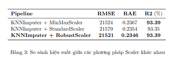 Tất cả các pipeline đều cho kết quả tốt với $R^2$ khoảng 93%, chỉ có một chút sự khác biệt nằm ở RMSE và RAE, nơi mà các scaler ảnh hưởng đến độ chính xác dự đoán.