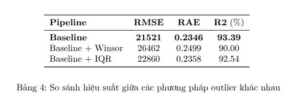 Việc áp dụng xử lý outlier lại cho kết quả tệ hơn: Winsor làm giảm hiệu suất rõ rệt, trong khi IQR chỉ giảm nhẹ. Điều này gợi ý rằng dữ liệu có thể không có nhiều outlier nghiêm trọng. Baseline sẽ không sử dụng bất kỳ phương pháp xử lý ngoại lai nào cho các pipeline sau.
