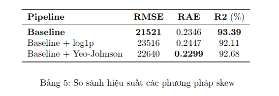 Cả hai pipeline đều cho kết quả khá tốt với $R^2$ trên 92%. Tuy nhiên, sự khác biệt giữa hai phương pháp là rõ rệt, Yeo-Johnson vượt trội hơn ở tất cả các chỉ số (RMSE và RAE thấp hơn, $R^2$ cao hơn). So với Baseline gốc ban đầu thì độ chính xác có giảm một chút (RMSE cao hơn, $R^2$ thấp hơn). Chính vì vậy, nhóm sẽ không sử dụng bất kỳ phương pháp xử lý phân phối lệch nào cho các pipeline phía sau.