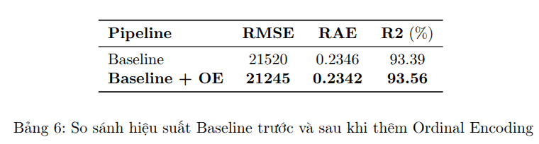 Việc thêm Ordinal Encoding chỉ mang lại cải thiện nhẹ nhưng nhất quán, cho thấy OE giúp xử lý tốt hơn các biến phân loại có thứ tự, làm cho dữ liệu phù hợp hơn với mô hình mà không gây overfitting. Ở stage cuối cùng Ordinal Encoding sẽ là pipeline mặc định.