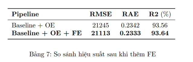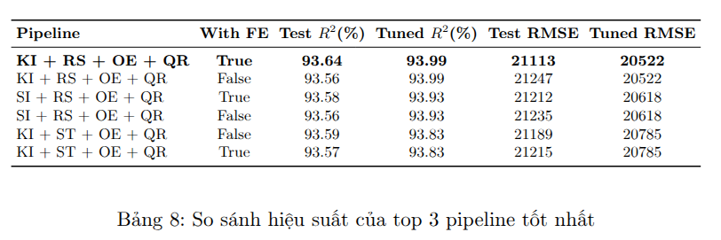 Tối ưu hóa Hiệu suất: Quá trình tinh chỉnh siêu tham số bằng Optuna là bước quyết định, nâng cao độ chính xác tổng thể của mô hình. Cụ thể, pipeline tốt nhất sau khi tối ưu siêu tham số đạt được hiệu suất dự đoán cao nhất: $R^2$ là $94.03\%$ và RMSE là $20458$.