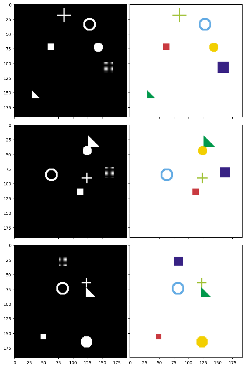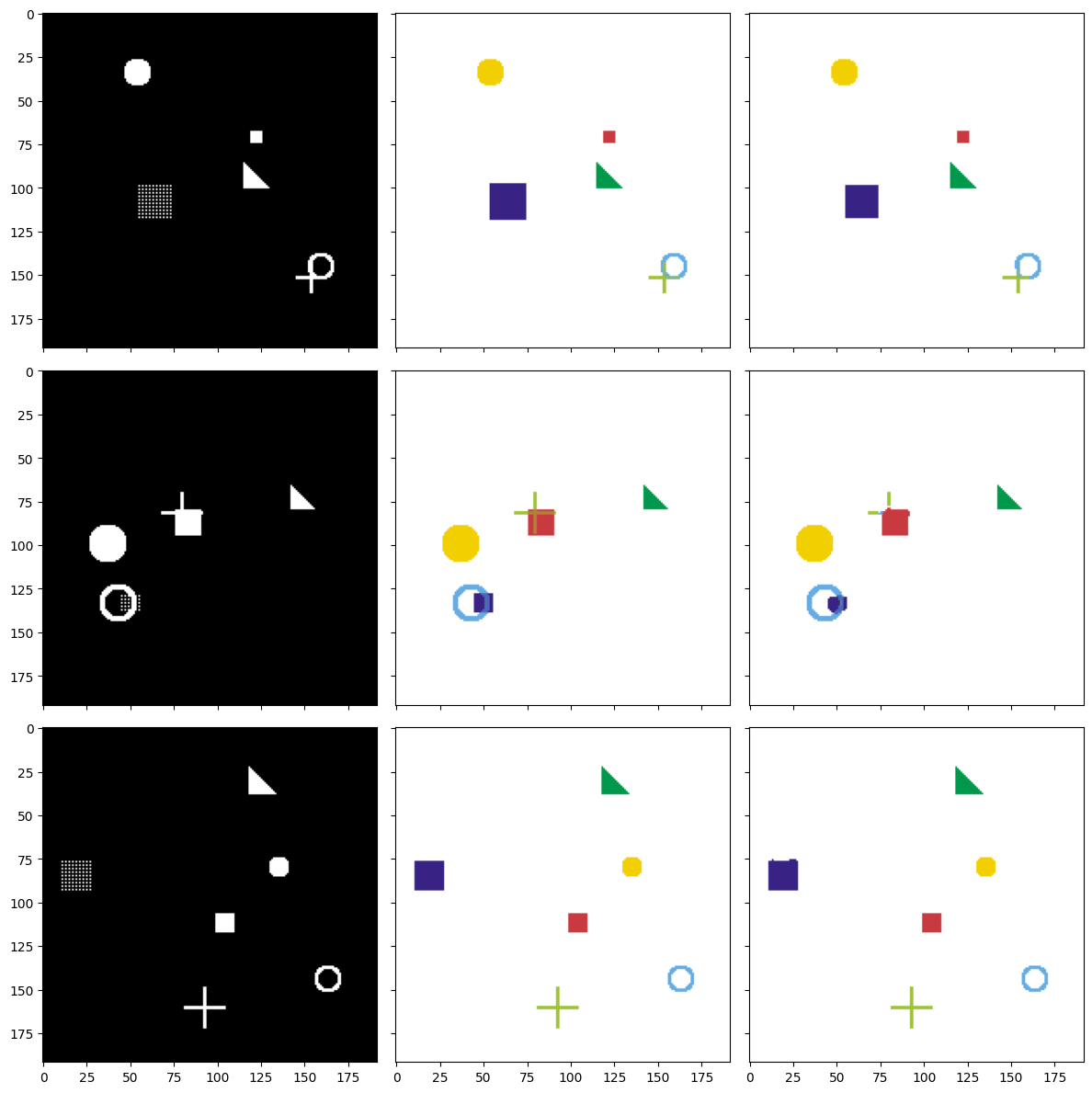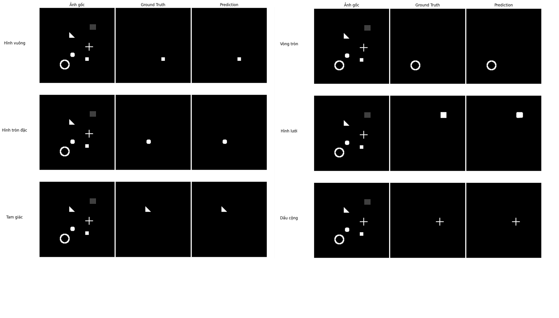 Nhìn vào hình vẽ, chúng ta nhận thấy cột Dự đoán (phải) gần giống với cột Mask thực tế (giữa). Điều này cho thấy mô hình đã học được cách phân biệt các hình dạng khác nhau, xác định đúng vị trí của từng đối tượng trong ảnh và tạo ra mask riêng biệt cho mỗi loại hình.