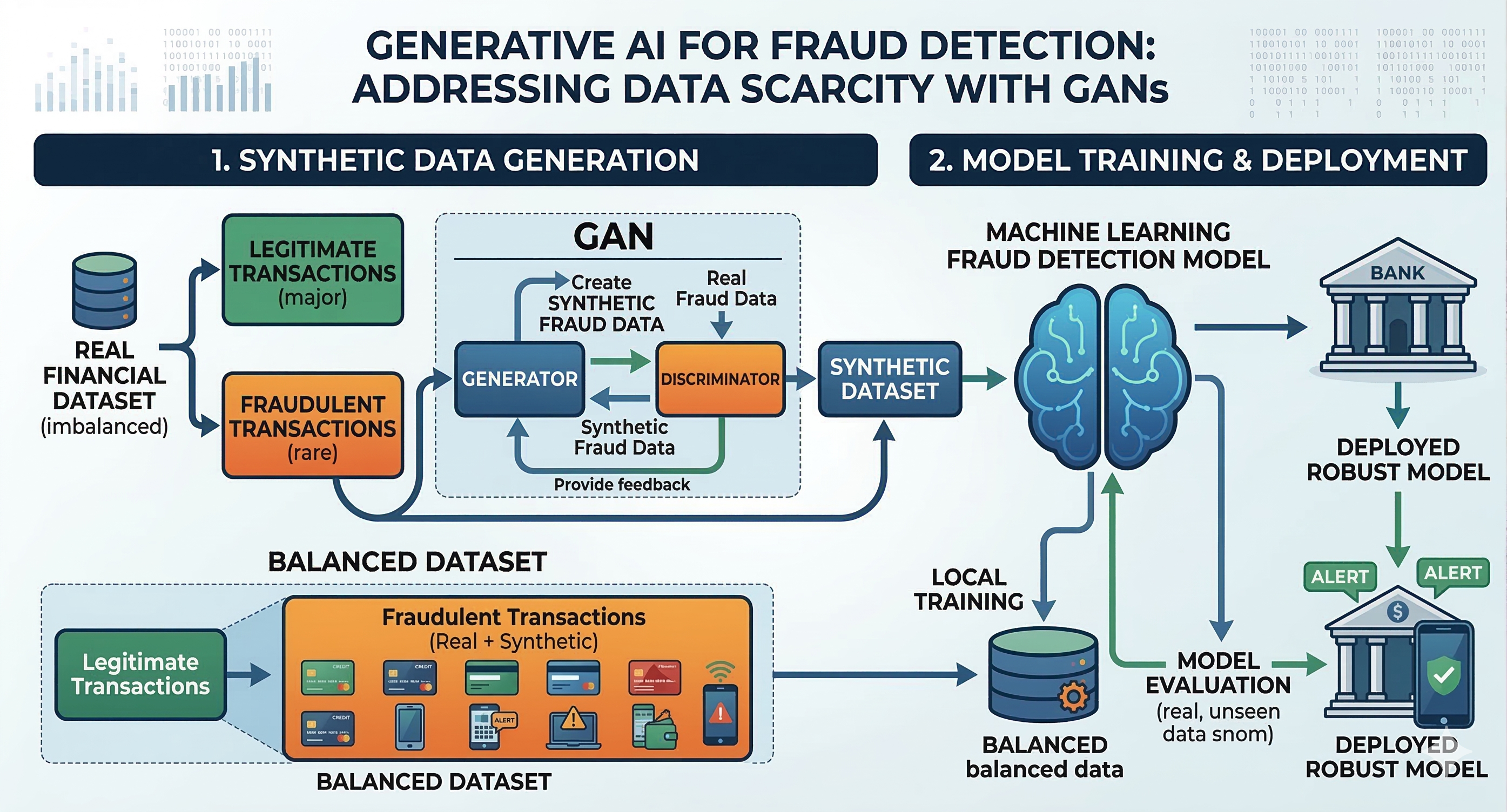 When there are not enough examples to learn from, AI systems can easily miss new or more sophisticated types of fraud. This is where Generative AI becomes especially valuable. A common approach is to use GANs, short for Generative Adversarial Networks, to create synthetic datasets that closely resemble real fraud cases. Instead of waiting for fraud to occur in the real world, we can proactively generate a wide variety of fraud scenarios to train our models.