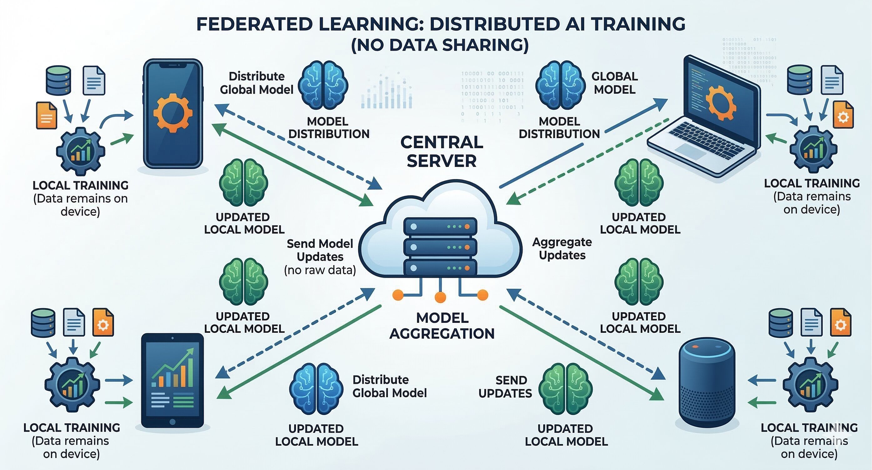 Federated Learning offers an elegant solution to this problem. Instead of moving sensitive data around, each bank keeps its data securely within its own system and only shares learned patterns or signals of fraudulent behavior with a shared network.
