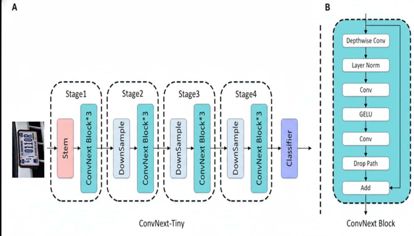 - Đặc điểm: ConvNeXt là mạng CNN được thiết kế lại theo tư duy hiện đại, sử dụng Depthwise Convolution và Large Kernel ($7 \times 7$), giúp mở rộng trường thụ cảm và nắm bắt tốt cấu trúc hình học của ký tự.