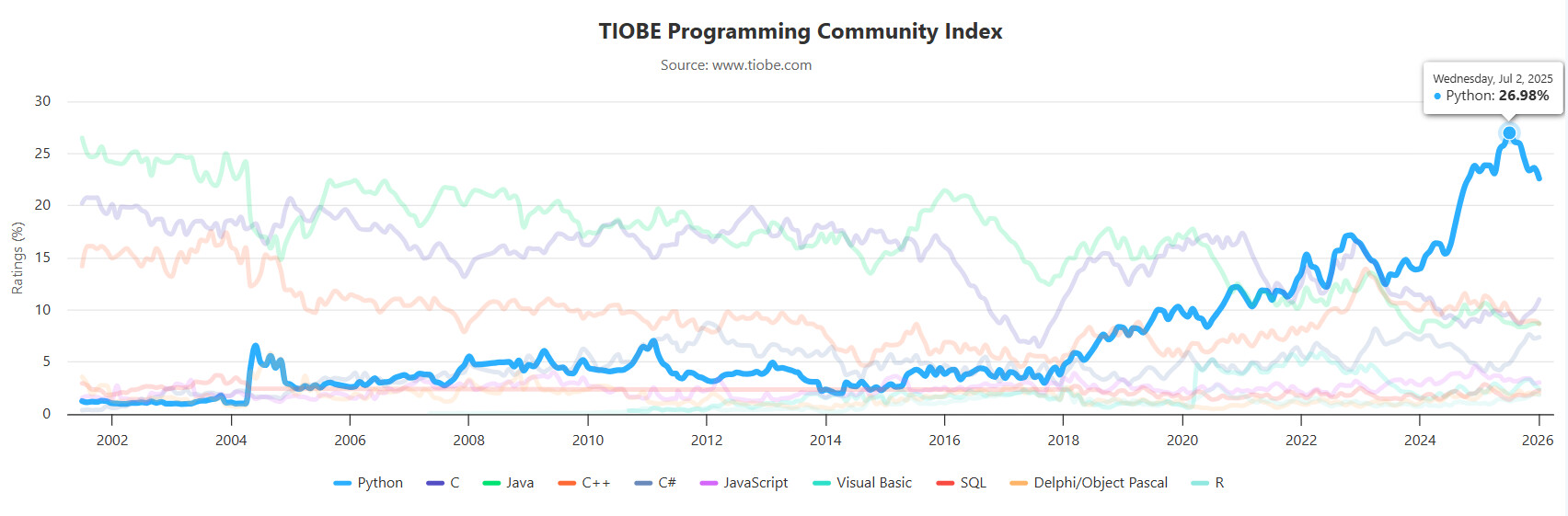 Hình 2. Vào tháng 7 năm 2025, Python đạt 27% trên bảng xếp hạng TIOBE - mức cao nhất từ khi bảng xếp hạng này ra đời năm 2001