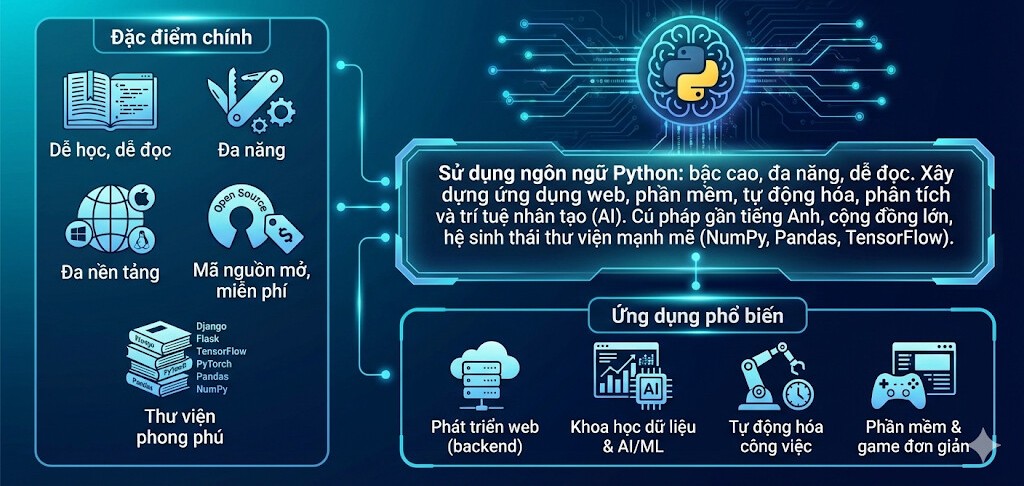 Python là một ngôn ngữ lập trình bậc cao, đa năng, dễ đọc được dùng để xây dựng ứng dụng web, phần mềm, tự động hóa tác vụ, phân tích dữ liệu và phát triển trí tuệ nhân tạo (AI).