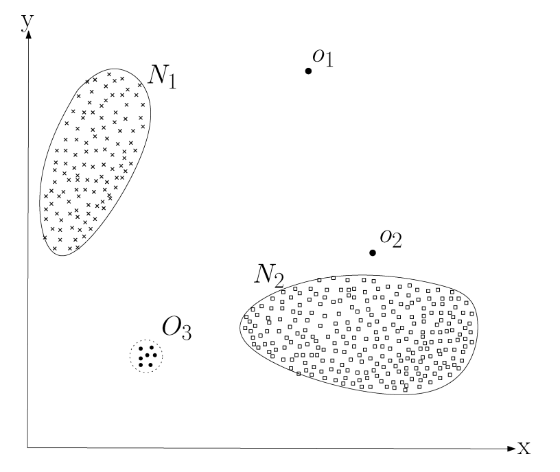 Trong hình minh họa dưới đây, các điểm như $o_1$, $o_2$ hoặc những điểm nằm trong vùng $O_3$ thường được xem là bất thường vì chúng nằm ngoài ranh giới của vùng dữ liệu bình thường. Chính vì vậy, chúng được phân loại là point anomalies.