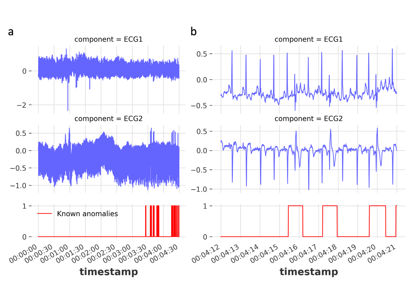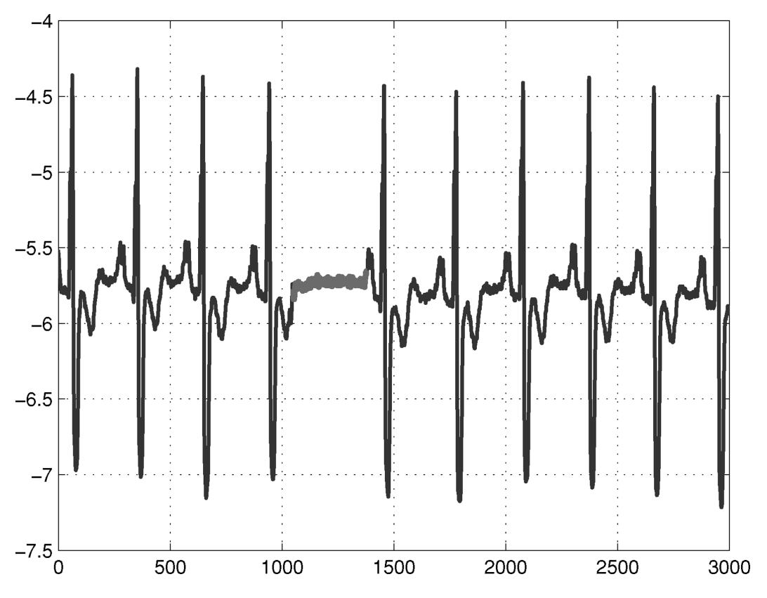 Hình dưới đây minh họa một ví dụ về tín hiệu điện tâm đồ (ECG) của con người [Goldberger et al., 2000]. Vùng được đánh dấu được xem là bất thường vì giá trị thấp kéo dài trong một khoảng thời gian bất thường (tương ứng với hiện tượng Atrial Premature Contraction). Lưu ý rằng bản thân giá trị thấp đó không phải là bất thường, nhưng việc nó kéo dài trong một khoảng thời gian dài mới tạo ra bất thường.